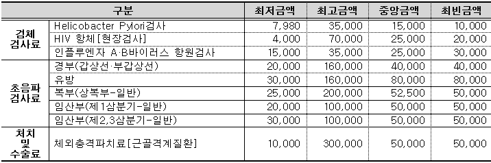 경부초음파(갑상선·부갑상선)의 최빈값은 상급종합병원은 18만천원, 의원은 4만원이며, 체외충격파치료(근골격계질환)의 최빈값은 상급종합병원은 10만4천원, 의원은 5만원이다.