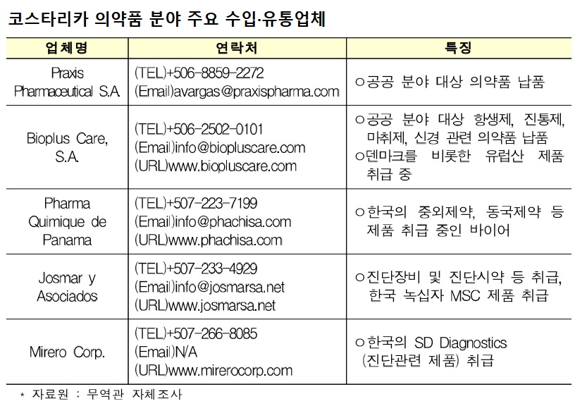 KOTRA는 "의약품은 한국의 對코스타리카 수출품목 중 상위 5위를 기록하고 있는 주요 품목"이라며 "공공 의료부문의 의약품 부족 현상 해소를 위한 정부기관(보건부)주도의 의약품 및 의료장비 대량구매 입찰 기회가 다수 있다"고 선정 사유를 밝혔다.