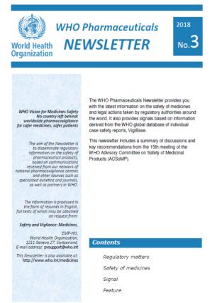 이번에 개발한 에페리손, 라모트리진, 설파살라진 관련 안전정보가 게재된 WHO 뉴스레터 최신호(2018년 3호)는 WHO 홈페이지(www.who.int/medicines/publications/newsletter/en/) > Regulatory Matters에서 확인할 수 있다.