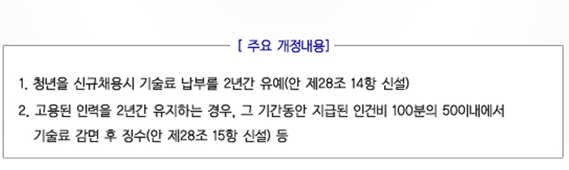 제28조 14항에서는 청년을 신규 채용하면 기술료 납부를 2년 간 유예하는 조건이 마련됐다.