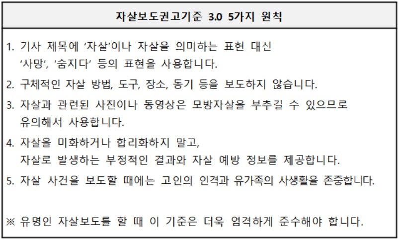 특히 이번 개정은 변화하는 언론환경을 감안해 전통적인 언론매체 뿐만 아니라 1인 미디어(매체)‧소셜미디어 역시 자살사건을 이야기하는데 책임감을 가져야 함을 포함하고 있다.