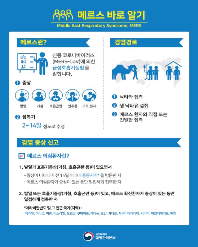 아울러 중동지역 여행 후 14일 이내에 발열과 기침 등 호흡기 증상이 있을 때는 의료기관을 바로 방문하지 말고 질병관리본부 콜센터(전화 1339) 또는 관할 보건소로 신고할 것을 거듭 당부했다.