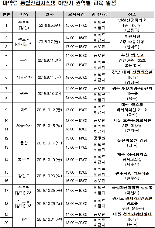 한국의약품안전관리원(원장 한순영)은 5월 18일 시행된 마약류 취급보고 제도의 원활한 운영을 위해 9월 5일부터 10월 31일까지 마약류취급자 및 마약류 담당 공무원 대상 설명회를 전국 10개 권역에서 실시한다.