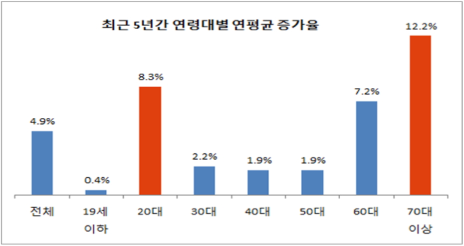 5년간 연평균 증가율 또한 70대 이상 7.6%로 가장 높았고, 20대 7.4% 그 뒤를 이었으며 다른 연령대의 증가율과는 다소 차이를 보였다.