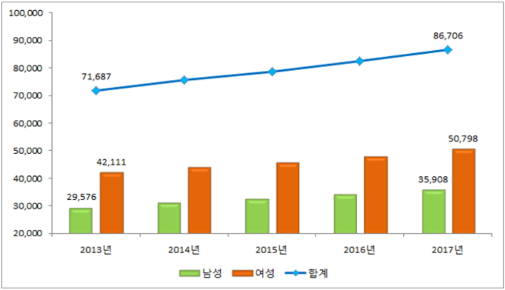 성별 진료실인원은 5년간 여성이 남성보다 1.4배 많았고, 남성은 2013년 29,576명에서 2017년 35,908명으로 연평균 5.0%(6,332명) 증가하였고, 여성은 2013년 42,111명에서 2017년 50,798명으로 연평균 4.8%(8,687명)이 증가했다.