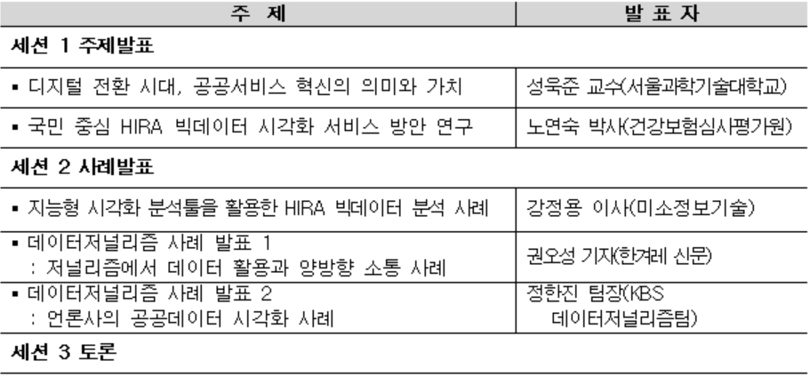 김승택 심사평가원장의 환영사와 허윤정 심사평가연구소장의 개회사를 시작으로, 최신 디지털 기술을 적용한 공공서비스 혁신의 의미와 가치에 대한 기조발표, 인공지능 기술 탑재 지능형 HIRA 빅데이터 시각화 서비스 개발 방안 및 언론사의 공공데이터 시각화 사례 발표 후 관련 전문가의 토론이 진행될 예정이다.