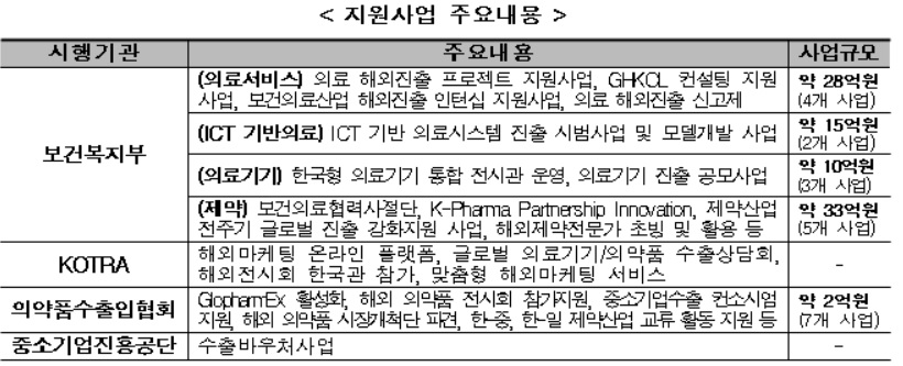 중소 제약기업 대상으로, 해외 인허가, 수출품목 생산시설 선진화(GMP), 현지법인 설립 및 수출 품목 등록에 필요한 컨설팅 등 제반 비용을 지원하고, 해외 각 국의 제약 전문가를 활용, 온·오프라인 상에서 국내 기업의 해외진출을 위한 동반자(파트너) 발굴, 현지 인허가 제도 안내, 계약 중개 등을 지원하는 '해외제약전문가 초빙 및 활용' 제도도 시행한다.