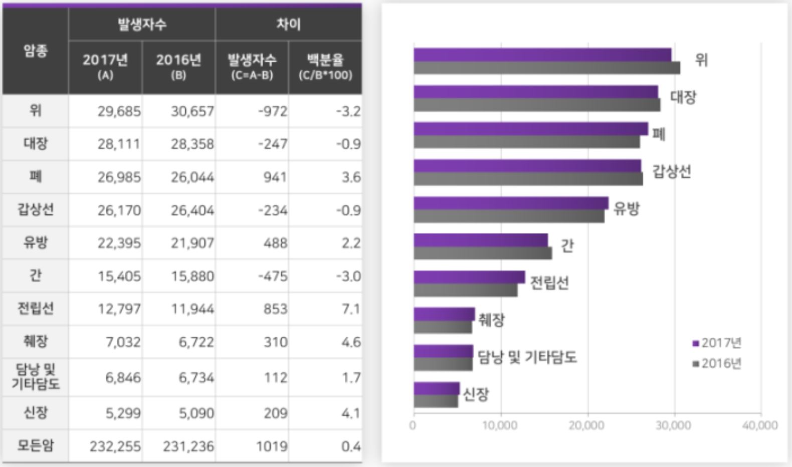 남자 암 발생 순위는 위암–폐암–대장암–전립선암–간암-갑상선암 순이며 여자는 유방암–갑상선암–대장암 –위암–폐암-간암 순이다.