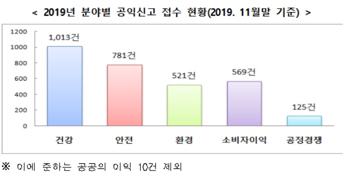 30일 국민권익위원회(이하 권익위) 분석에 따르면, 올해 권익위에 접수된 공익신고는 전년 대비 약 1.5배 증가한 4,807건으로, 이 중 건강 분야가 21.1.%로 가장 많았다. 특히, 지난해 10월 도입된 '비실명 대리신고제도'로 '버닝썬 사건' 등 공익신고 사건이 사회적으로 큰 이슈가 됐다.