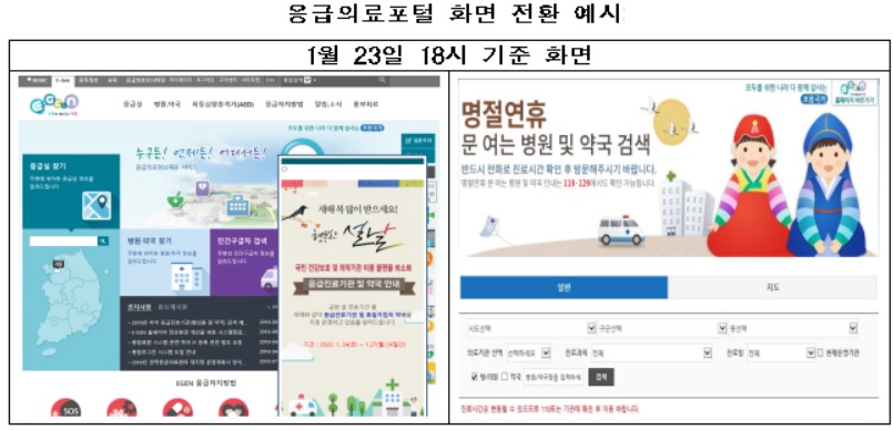 오는 23일 18시부터 응급의료포털 접속 시 명절 전용 화면으로 전환되며, 별도 알림창으로 문 연 병·의원 약국 정보를 확인할 수 있다.