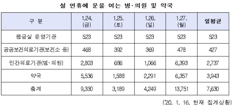 올해 설 연휴 동안 국민의 의료이용을 위해 운영되는 요양기관이 일평균 7,630곳에 달하는 가운데, 설 당일에는 병원·약국 등 3,189개 기관이 운영된다.