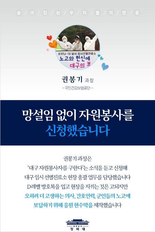 청와대는 10일 국민건강보험공단 권봉기 과장을 코로나 19의 '숨어있는 우리들의 영웅 1번'으로 선정했다.