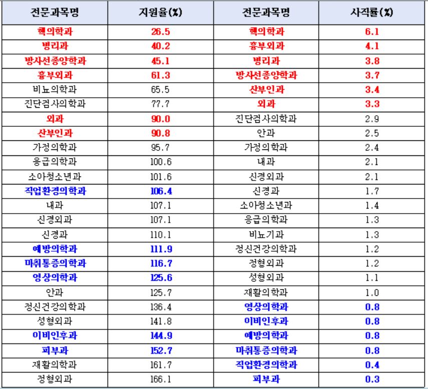 반면, 높은 전공의 지원율을 보인 △정형외과(166.1%), △재활의학과(161.7%), △피부과(152.7%), △이비인후과(144.9%), △성형외과(141.8%) 등의 진료과들은 0.3%~1.2% 정도의 비교적 낮은 사직률을 나타냈다.