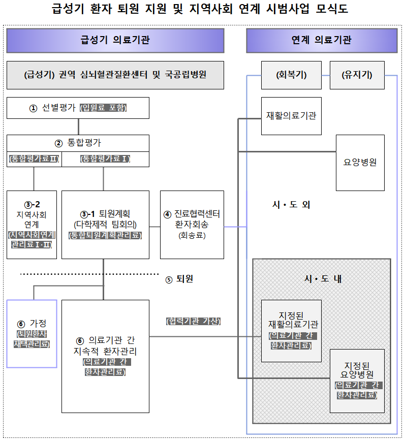 이에 따라 환자별 치료요구도 및 사회·경제적 지원 필요성 등을 종합적으로 파악하고 이를 바탕으로 의료적·지역사회 자원과 연계하고 관리할 수 있도록 건강보험 수가를 적용하는 것으로, 다학제 팀 구성이 가능한 권역 심뇌혈관질환센터 및 국공립병원에서 구체적 퇴원계획을 수립해 환자 및 보호자에게 설명하고, 지역사회의 복지 자원에 대한 정보를 제공한다.