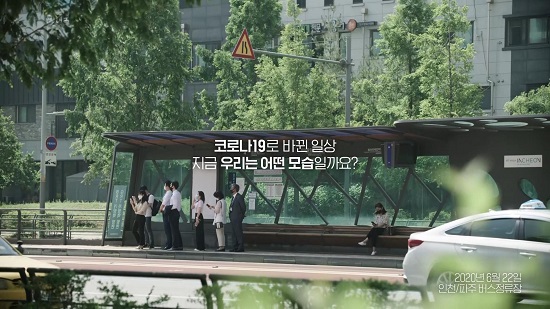 버스정류장에 붙어서 있는 시민들에게 거리두기를 유도하는 대형 전광판을 노출, 스스로 자리를 옮겨가 자막이 완성되는 모습을 가시적으로 제시했다.