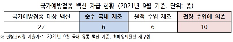 국회 보건복지위원회 소속 더불어민주당 최혜영 의원은 질병관리청이 제출한 자료를 검토한 결과, 국내 유통중인 국가예방접종 백신 22종 중 국내 제조회사에서 원액부터 완제품까지 제조해 공급 가능한 백신은 6종에 불과한 것으로 드러났다.