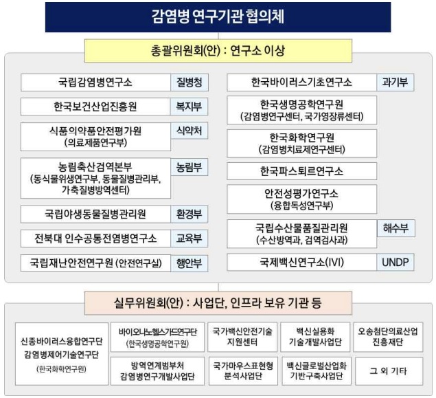 이를 위해 국립감염병연구소 등 국가 책임기관을 중심으로 감염병 연구기관 협의체를 구축‧운영하게 된다. 국가 책임기관을 중심으로 관련 연구기관 간 성과 지향적 연구협력을 강화하려는 목적이다.