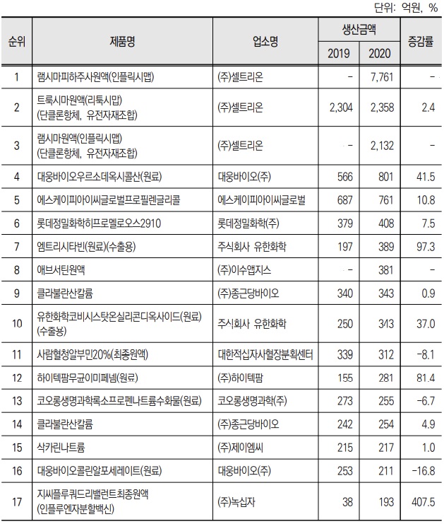 반면 국내 원료의약품 시장은 2020년 약 35억 달러로, 약 75%가 합성의약품 원료이며 내부소비용 원료의약품의 비중이 높은 상황이다. 2019년 국내 원료의약품 생산액은 2조4,706억원으로 263개 업체가 파악되고 있으며, 2020년 상위 3개 바이오시밀러 제품이 전체 생산의 34.6%를 차지한 것으로 나타났다. 수출은 2020년 약 17억 달러로 일본과 중국으로의 비중이 큰 것으로 확인됐다.