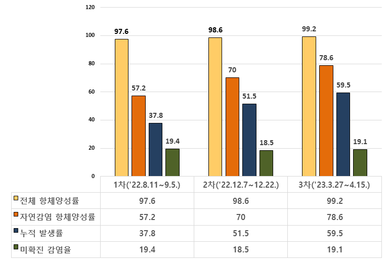 대상자 9798명의 전체 항체양성률(자연감염+백신면역 모두 포함)은 99.2%로 2차 조사 결과인 98.6%와 유사했으나, 자연감염 항체양성률은 78.6%로 2차 조사 결과인 70% 보다 8.6%p 증가했다. 다만 지역사회 미확진 감염률은 19.1%로 2차 조사 결과인 18.5%와 유사했다.
