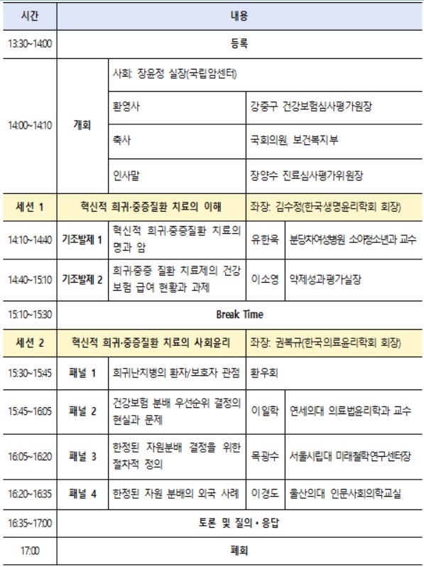 심포지엄 일정표. ©건강보험심사평가원건강보험심사평가원(원장 강중구, 이하 심사평가원)은 9월 25일, 가톨릭대학교 서울성모병원 성의회관 마리아홀에서 ‘희귀·중증 질환 치료방향과 사회윤리’를 주제로 심포지엄을 개최한다.