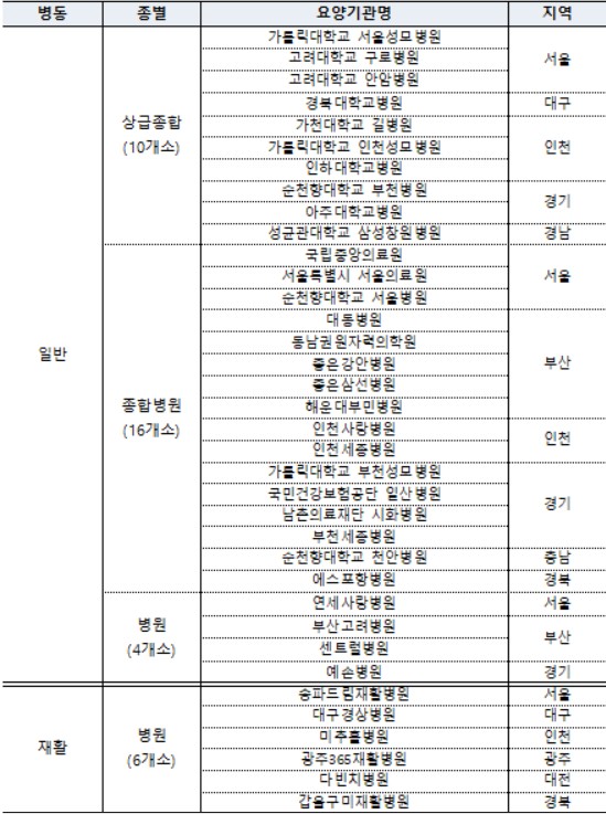 패널병원은 간호·간병통합서비스 사업을 모범적으로 운영하고 있으며 적정한 규모와 시설 수준을 갖춘 우수 의료기관으로, 상급종합병원 10개소, 종합병원 16개소, 병원 4개소, 통합재활병동 운영기관 6개소가 선정됐다.