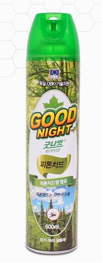 회사 측에 따르면 한국디비케이의 20년 노하우를 이용하여 만든 신제품인 '굿나잇에프에어졸 600mL'은 기존의 500mL보다 용량을 100mL 높인 국내 최고 용량의 모기에어졸로 피톤치드향을 첨가했다.