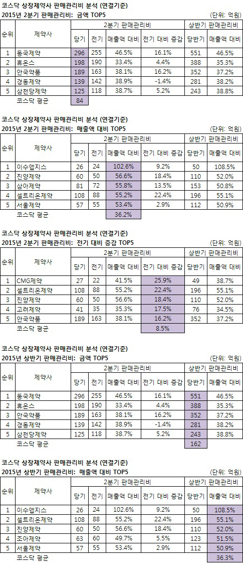 코스닥 상장=25개 제약사를 분석한 결과 동국제약(296억) 휴온스(198억) 안국약품(189억) 경동제약(139억) 삼천당제약(125억)이 2분기 판매관리비 지출 '톱5'에 들었다(평균 84억)