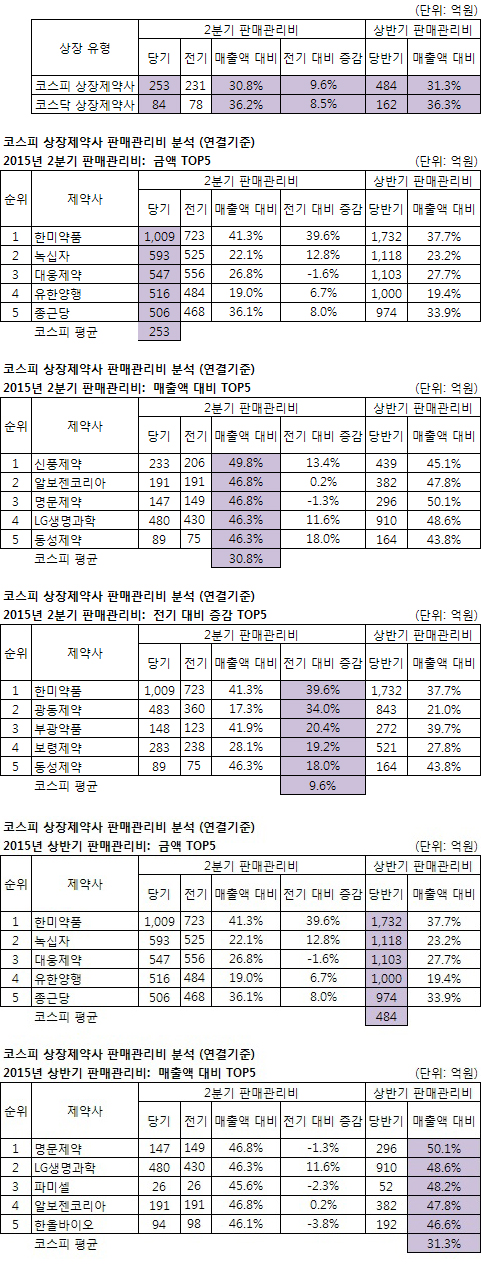 코스피 상장 제약사 중 매출액 대비 판매관리비가 가장 높은 제약사는 신풍제약, 코스닥 상장 제약사 중에서는 이수앱지스인 것으로 나타났다. 또 전기대비 2분기 판매관리비가 가장 증가한 제약사는 코스피는 한미약품, 코스닥은 CMG제약으로 분석됐다.
