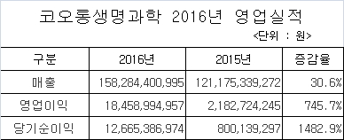 코오롱생명과학, 2016년 매출 1,583억…전년比 30.6%↑