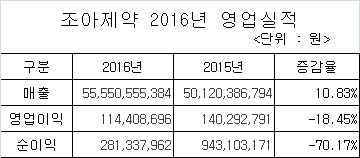조아제약, 2016년 매출 556억…영업이익·순이익은 급감
