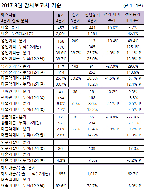 4분기 순이익은 전기대비 45억 감소(영업이익 40억 감소)했고, 전년대비 27억 증가(법인세 16억 감소, 외환산이익 9억 증가)했다. 누적 순이익은 전년대비 362억 증가(+143.9%=영업이익 431억 증가, 법인세 87억 증가)했다.