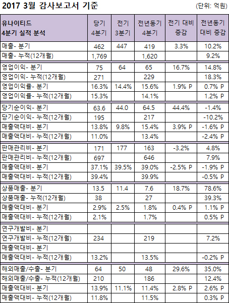 4분기 순이익은 전기대비 19.5억 증가(+44.4%=영업이익 11억 증가, 외화환산이익 9억 증가), 전년대비 0.9억 감소했고, 누적 순이익은 전년대비 22억 감소(영업이익 42억 증가, 관계기업투자손익 10억 감소,기부금 11억 증가)했다.