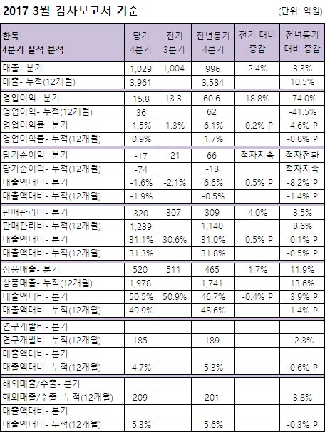 영업이익은 36억으로 41.5% 감소했고, 순이익은 -74억으로 '적자지속'했다.