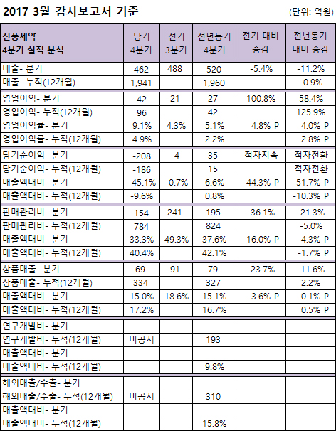 부문별로 4분기 매출은 전기대비 26억(상품매출 22억 감소), 전년대비 58억 감소(-11.2%=제품매출 74억 감소) 각각 감소했고, 누적 매출은 전년대비 18억 감소(제품매출 98억 감소,반품추정매출 10억 감소, 기타매출 84억 증가)했다.