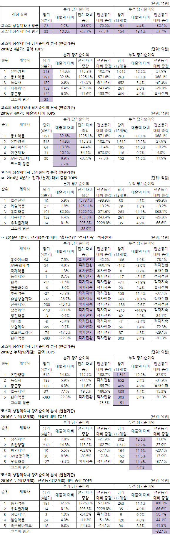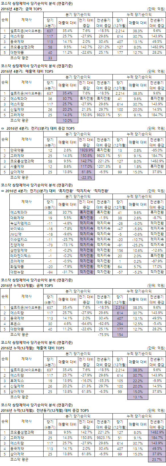 제약사별(3분기 대비 4분기)=안국약품은 12억 증가(영업이익 24억 증가, 기타손익 9억 감소), 고려제약은 15억 증가(영업이익 21억 증가, 법인세 5억 증가), 코오롱생명과학은 34억 증가(영업이익 66억 증가, 외환차손익 23억 감소, 유형자산처분손실 6억 증가), 서울제약은 6억 증가(영업이익 13억 증가, 무형자산손상차손 4억 증가, 법인세 4억 증가), 삼아제약은 10억 증가(영업이익 10억 증가)했다.