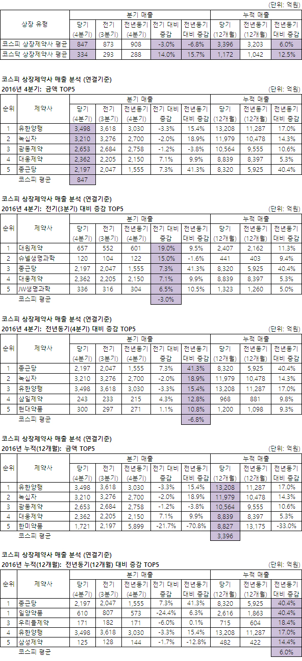 4분기(전년비)=종근당은 642억 증가(타미플루 284억 증가, 자누비아군 신규 281억 증가, 바이토린 신규 59억 증가), 녹십자는 509억 증가(제품매출 315억 증가, 상품매출 140억 증가), 유한양행은 468억 증가(제품매출 409억 증가, 상품매출 76억 증가, 용역수익 17억 감소), 삼일제약은 27억 증가(상품매출 견인), 현대약품은 29억 증가(제품매출 21억 증가, 상품매출 9억 증가)했다.