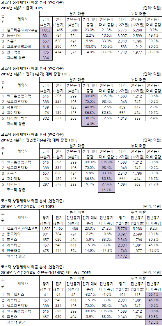 전기(3분기) 대비 증감률은 코오롱생명과학이 108.0%로 유일하게 100%를 넘은 가운데, 셀트리온제약 서울제약 고려제약 테라젠이텍스가 30%를 넘었다(평균 14.0%)