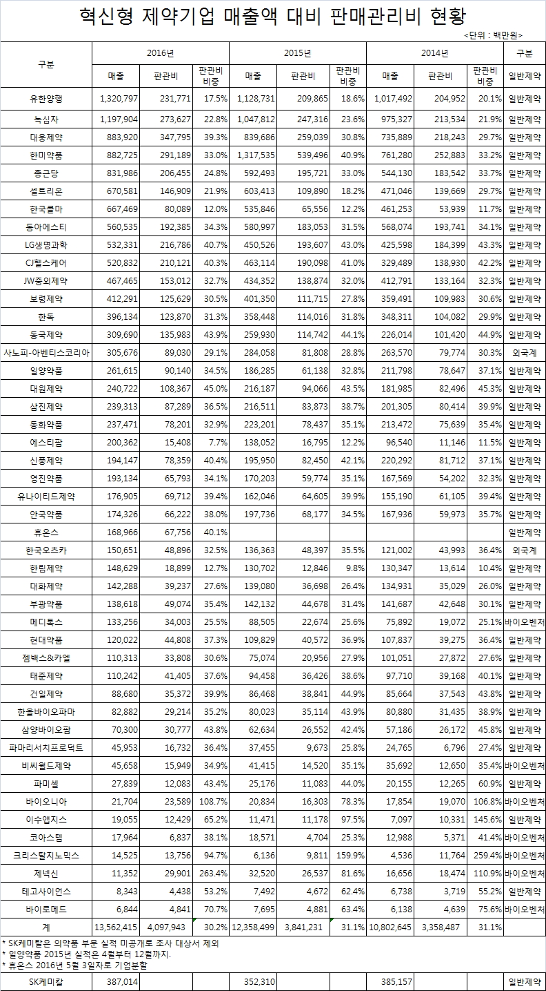 약업닷컴(www.yakup.cpm)이 혁신형 제약기업 인증업체들의 2016년 감사보고서를 분석한 결과, 매출액 대비 판매관리비 비중은 평균 30.2%로 집계됐다.