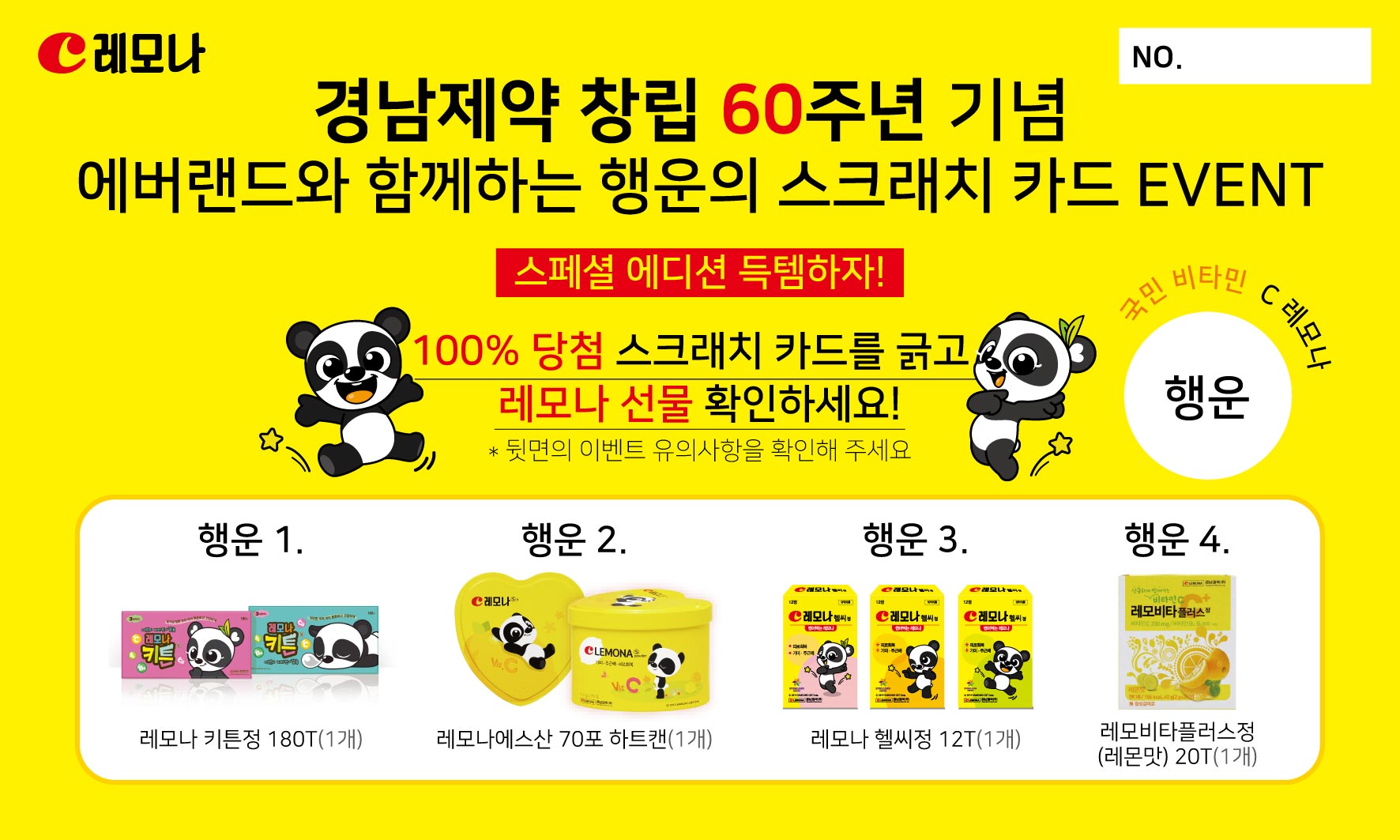 경남제약 홍보팀은 “경남제약 창립60주년을 맞아 변함없는 사랑을 보내주신 고객들에게 감사를 표하고자 이번 이벤트를 기획하게 됐다”며 “100% 당첨 이벤트로, 재미있는 스크래치 이벤트도 참여하고 올 봄에만 만날 수 있는 레모나X판다월드 스페셜 에디션을 득템하는 경품의 행운도 잡으시길 바란다”고 말했다.