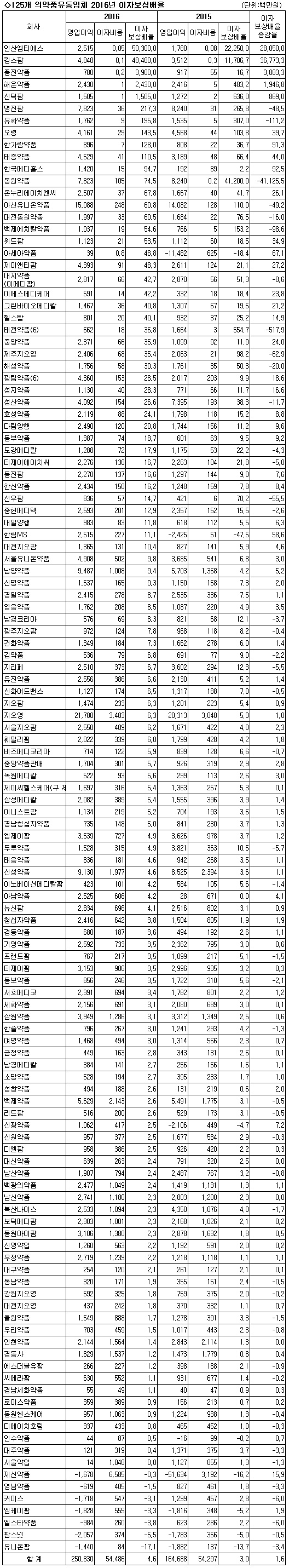 금융감독원에 2016년 감사보고서를 제출한 의약품유통업체 중 지난해 이자(금융)비용을 지출한 126개사의 이자보상배율을 분석한 결과 이들 기업은 영업이익 2,508억원, 이자비용 544억원으로 이자보상배율이 4.6배인 것으로 나타났다. 이는 전년 이자보상배율 3.0배 보다 크게 증가한 것이다.
