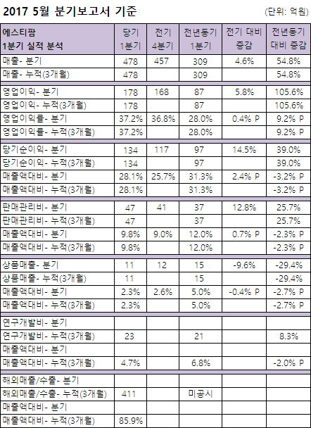 에스티팜은 '5월 분기보고서 기준' 1분기 478억의 매출을 달성, 전년동기대비 54.8% 성장했다.