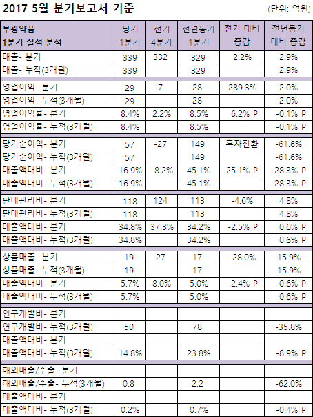 부광약품은 '5월 분기보고서 기준' 1분기 339억원의 매출을 달성, 전년동기대비 2.9% 성쟁했다.