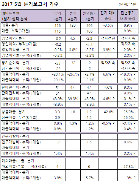 에이프로젠(구 슈넬생명과학)은 '5월 분기보고서 기준' 1분기 116억원의 매출을 달성, 전년동기대비 8.9% 성장했다.