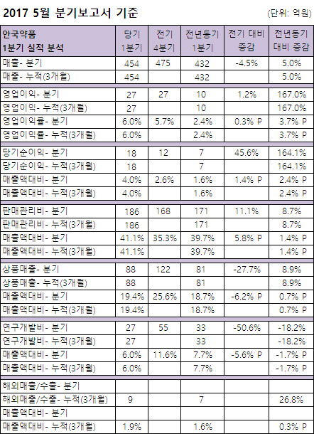 안국약품은 '5월 분기보고서 기준' 1분기 454억원의 매출을 달성, 전년동기대비 5.0% 성장했다.