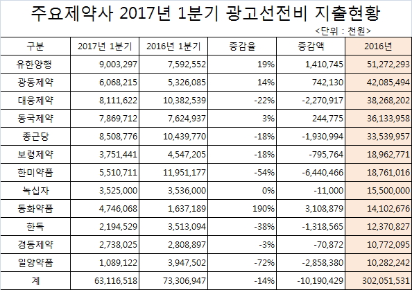반면 동화약품은 2016년 1분기대비 190% 증가한 31억 900만원의 광고선전비 지출을 늘렸고, 유한양행 14억 1,100만원, 광동제약약 7억 4,200만원, 동국제약 2억 4,500만원 등을 늘렸다.