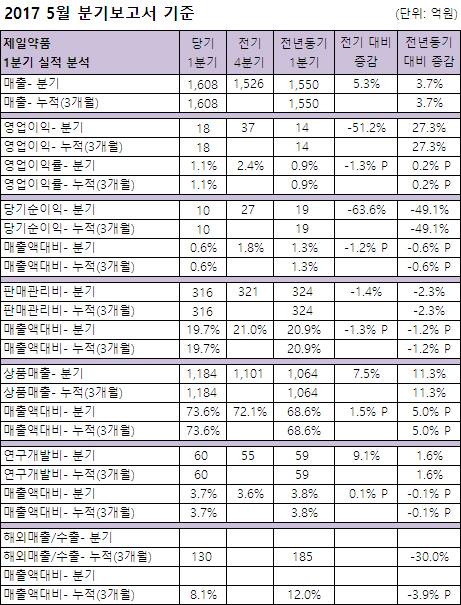 제일약품은 '5월 분기보고서 기준' 1분기 1,608억원의 매출을 달성, 전년동기대비 3.7% 성장했다.
