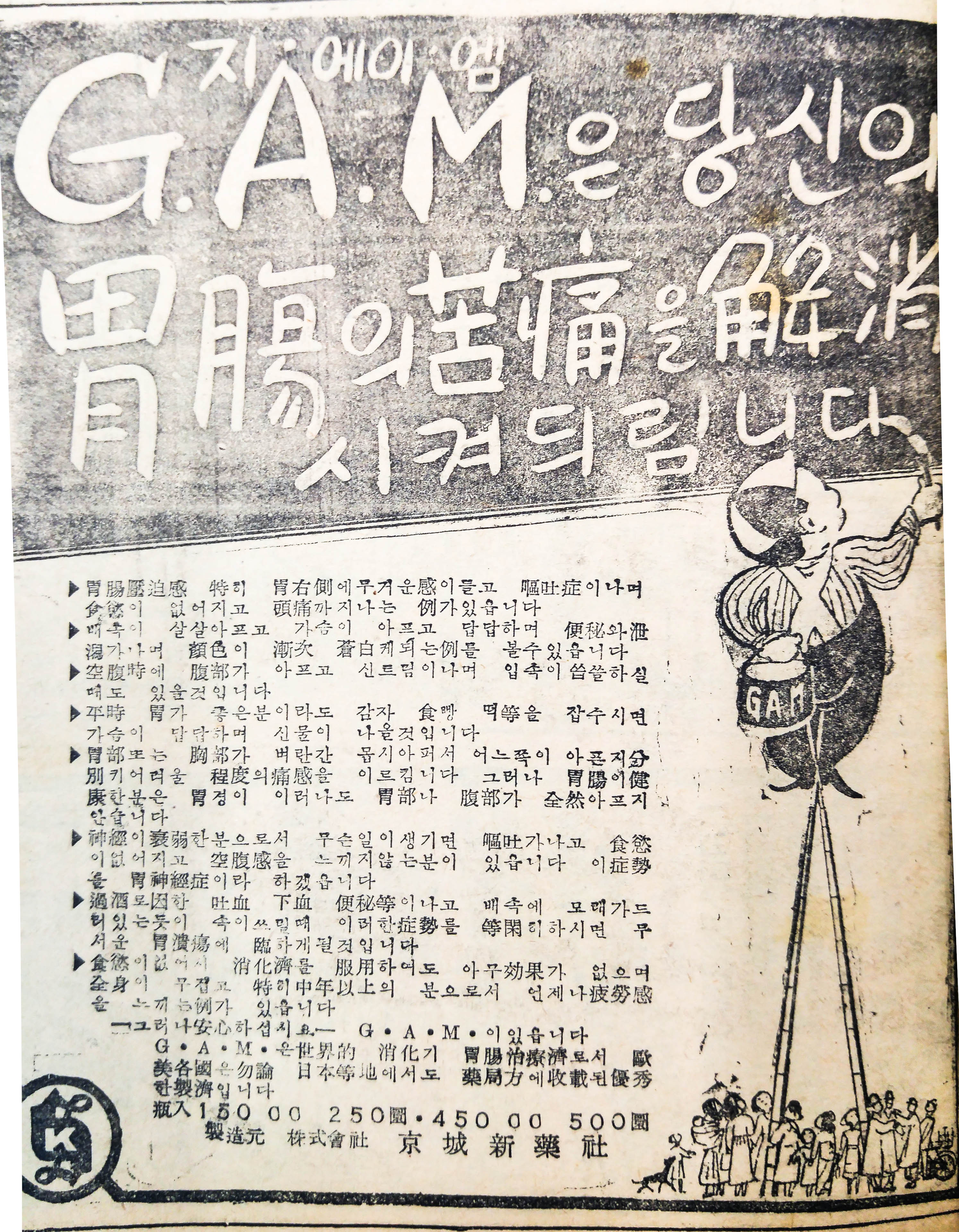‘G·A·M(지·에이·엠)은 당신 胃腸(위장)의 苦痛(고통)을 解消(해소) 시켜듸림니다.’라는 광고 문구에서 알수 있듯이 당시 인기있던 위염치료제중 하나였다.