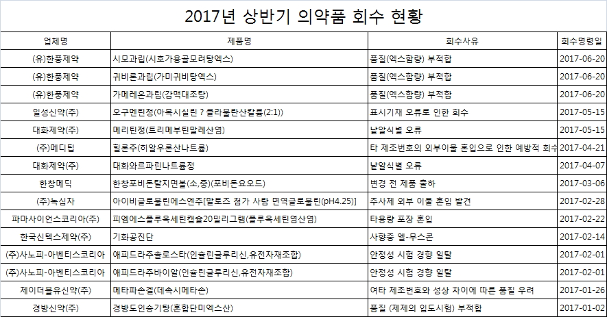 식품의약품안전처에 따르면 지난 1월 경방신약의 '경방도인승기탕(혼합단미엑스산)이 품질 부적합으로 회수 명령을 받은 것을 시작으로 총 10개 제약사의 17개 의약품이 올 상반기에 회수 조치를 받았다.