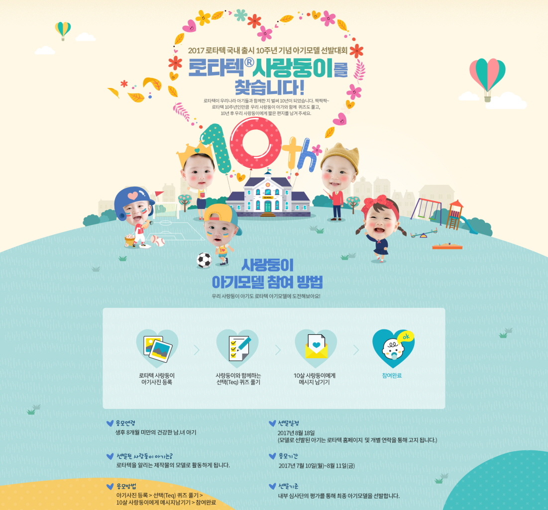 ’2017 로타텍® 아기모델 선발대회’는 생후 8개월 이하의 영아를 자녀로 둔 부모라면 누구나 참여 가능하다. 7월 10일부터 8월 11일까지 아기모델 선발대회 홈페이지에서 모바일이나 웹으로 응모하면 되며, 최종 선발된 5명의 '로타텍 사랑둥이'는 향후 1년간 로타텍을 대표하는 아기 모델로 활약하게 된다.