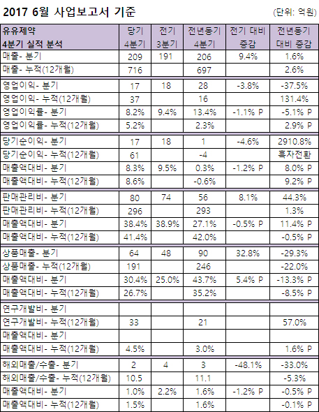 부문별로 매출(4분기)은 전기대비 18억 증가, 전년대비 소폭증가했다. 누적 매출은 전년대비 18억 증가(제품 73억 증가, 상품 54억 감소)했다.